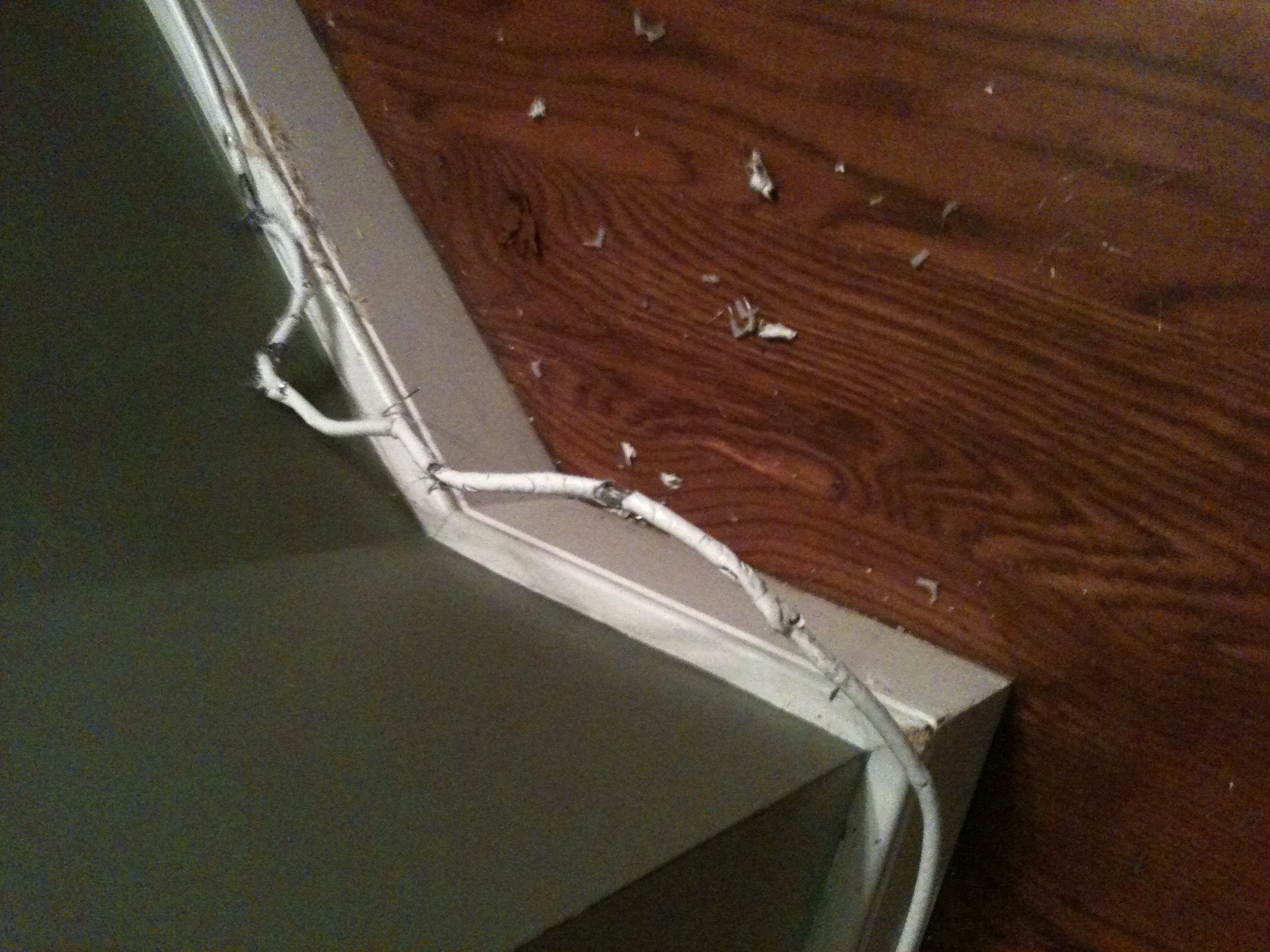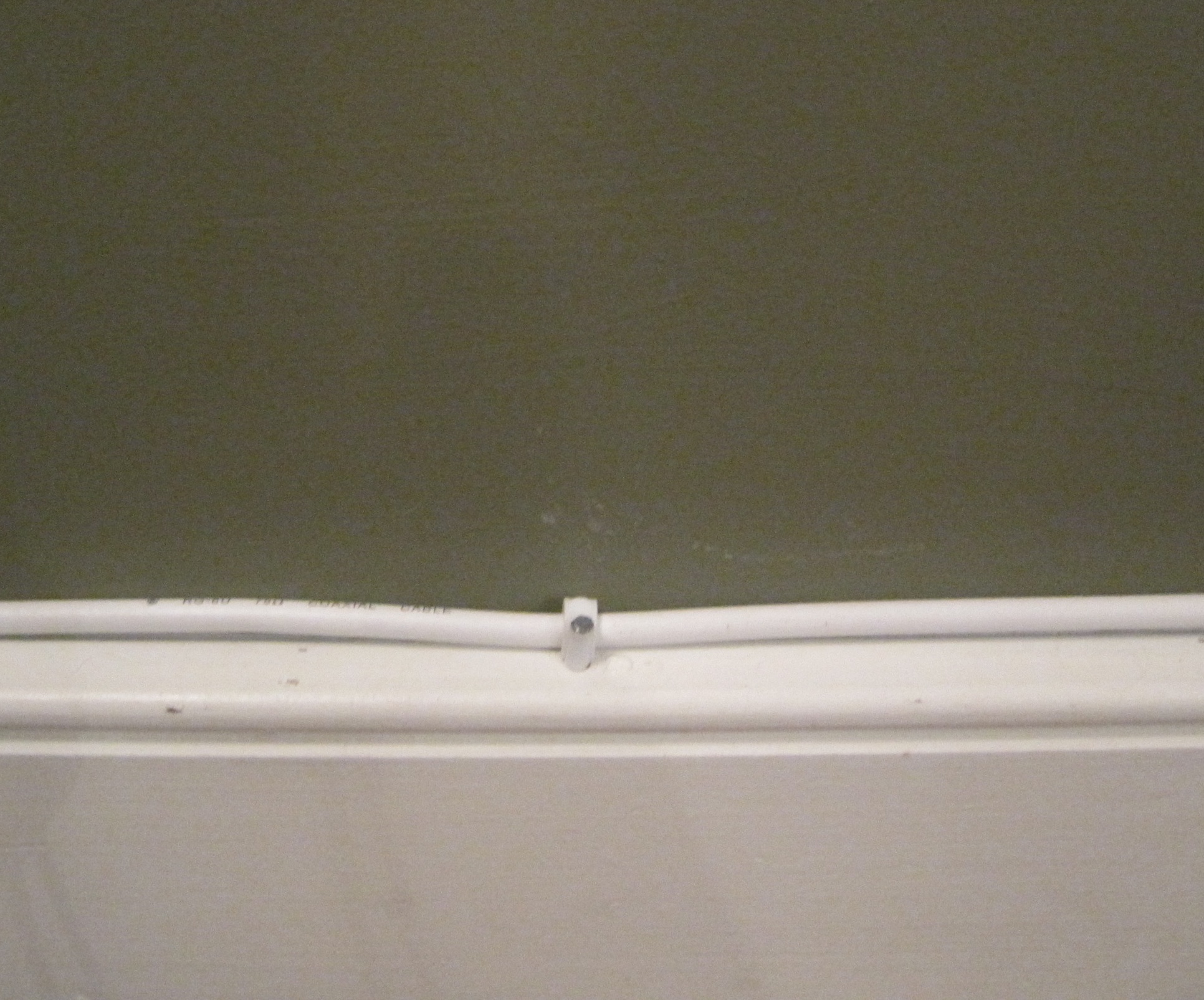 Picture of the how the cord was installed by Verizon with plastic covered staples.