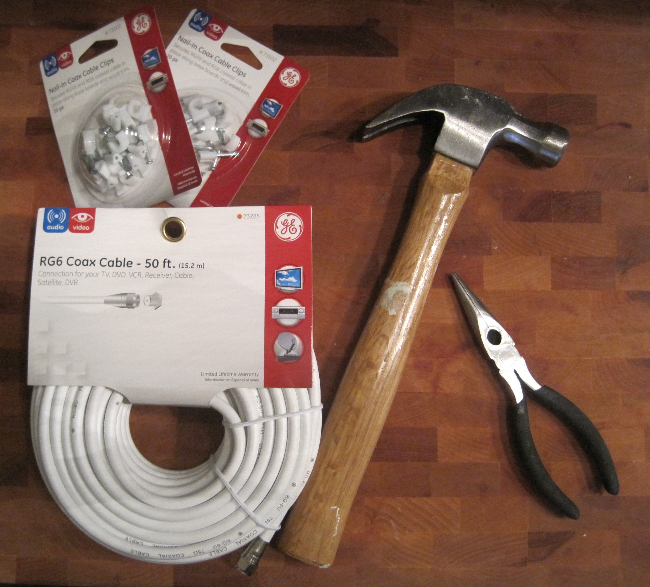 Shown here: hammer, needle-nose pliers, 50-ft. cable cord, and cable clips.