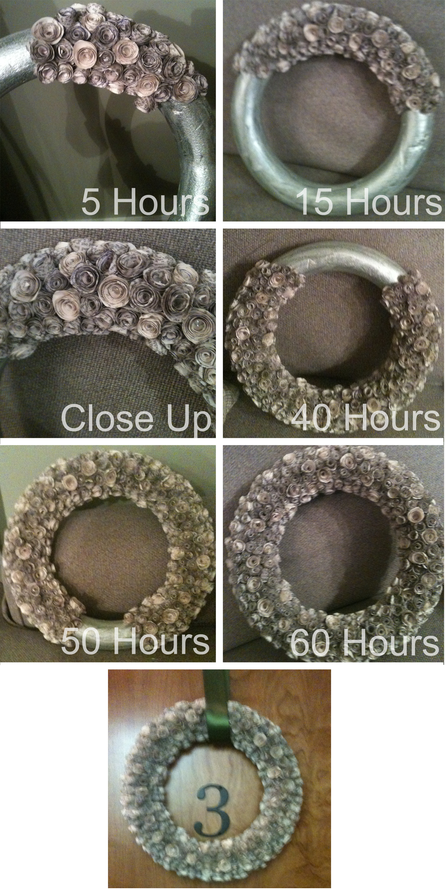 My first project was to recreate this wreath. The blog post said it took about a day and I had a bunch of smutty romance novels laying around, so one Saturday I started what I now not-so-lovingly call “The Great Twisting Challenge.”